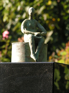 2004Een pastoor die onder het brevieren in slaap is gesukkeld. Bronzen beeld zittend op een stenen bankje.
