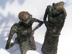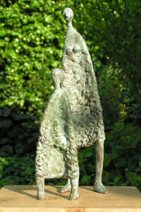 2002Twee vrouwen die in de wind staan te wachten. Twee bronzen losse beelden op stenen sokkels.